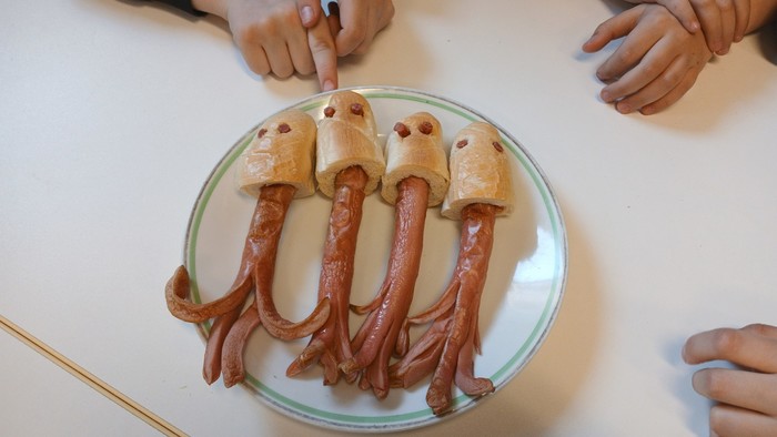Na závěr našeho miniprojektu Chobotničky jsme se vydali do cvičné kuchyně a vyrobili z párků chobotničky a navlékli jsme jim rohlíkové čepičky s kečupem. Krásně jsme je upekli v troubě a nakonec samozřejmě snědli. To byla dobrota!