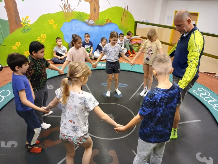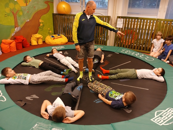 Proč si nezpříjemnit hodinu tělocviku trošku netradičně, třeba na velké trampolíně. Všichni se na ni hodně těšili a myslím nebyli zklamáni. Nejdřív trošku seznámení s plochou v leže, sedu, kleku a ve stoji a potom opravdové skoky do skrčky. A třeba až ke stropu!