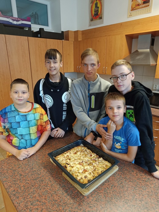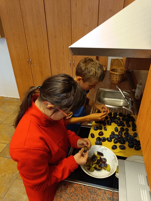 V kuchyňce jsme si upekli švestkový koláč. Druhý den jsme si na něm pochutnali ke svačině.
