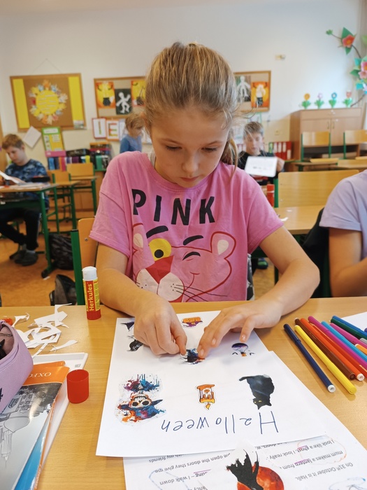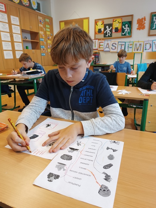 Téma Halloween nás provázelo různými předměty. Krásně vyzdobenou nástěnku jsme si vyrobili v pracovních činnostech a výtvarné výchově. Tématu jsme se věnovali i v hodině angličtiny, kde jsme se naučili spoustu nových slovíček a vypracovali jsme si halloweenský list.