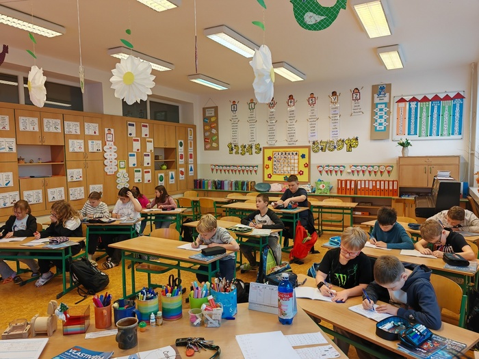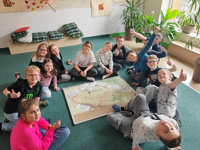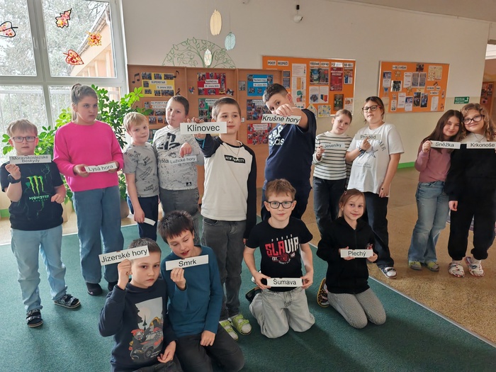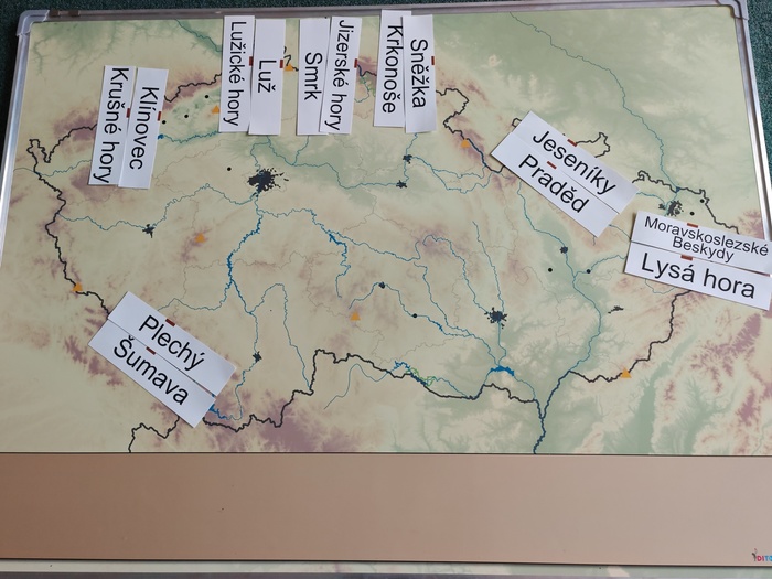 Žáci v hodině Vlastivědy pracovali s magnetickou mapou na téma pohoří a nejvyšší vrcholy. Z rozdaných pojmů vytvářeli dvojice a umísťovali do slepé mapy ČR. Zapamatované pojmy si následně zapsali do sešitu.