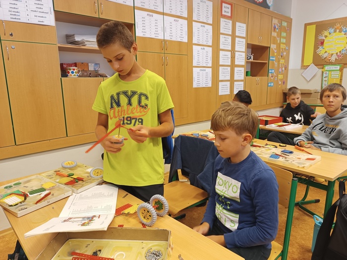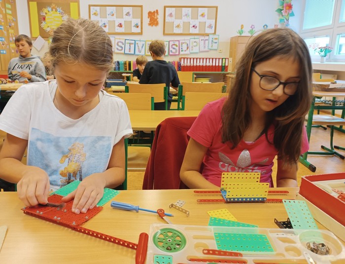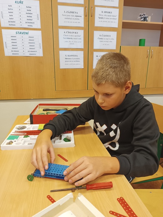 V pracovních činnostech si žáci z 5.A vyzkoušeli trpělivost při práci se stavebnicí Merkur. Hodně se u toho nasmáli a práce je velmi bavila.