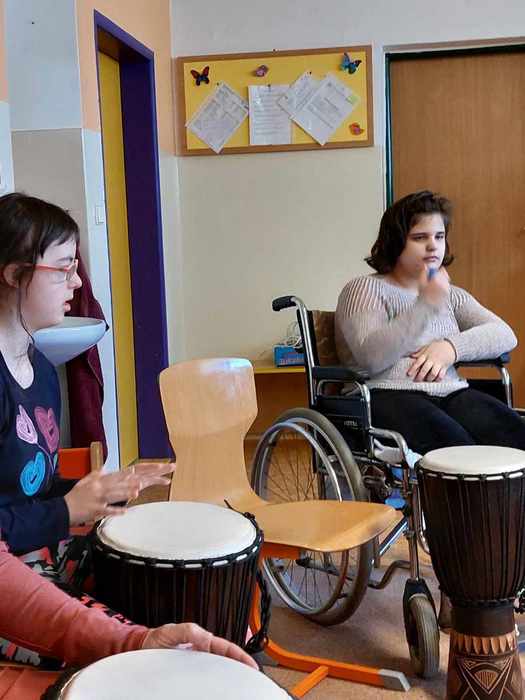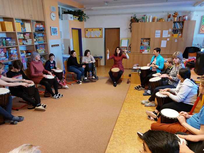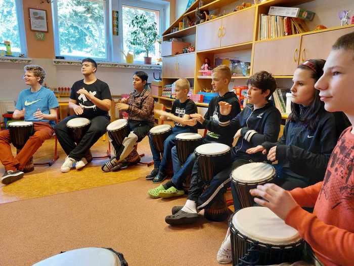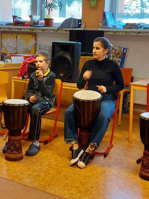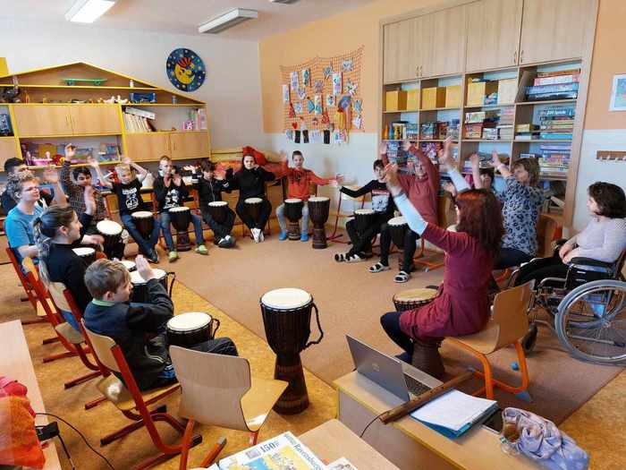 Ve čtvrtek 14. března si užili Džembíci hodinovou lekci muzikoterapie s paní Martinou Weinhöferovou. Hráli si s rytmem, na djembe i na tělo. Pro všechny to byla parádní zábava. Máme na škole krásně sehraný bubenický orchestr.