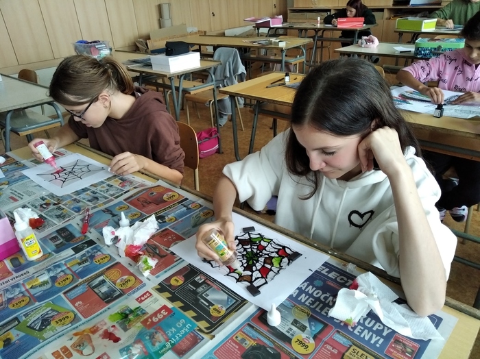 V rámci výtvarné výchovy se žáci 7.A připravují na Halloween, ke kterému dýně a pavučiny určitě patří.