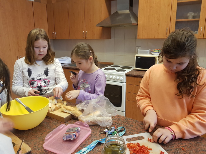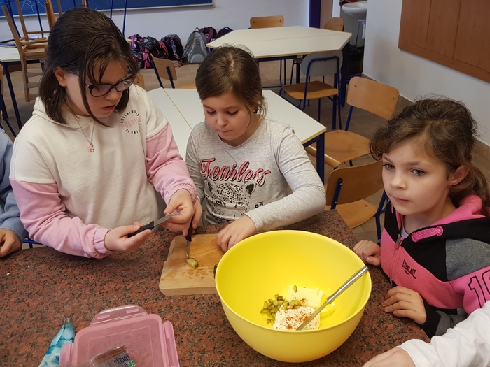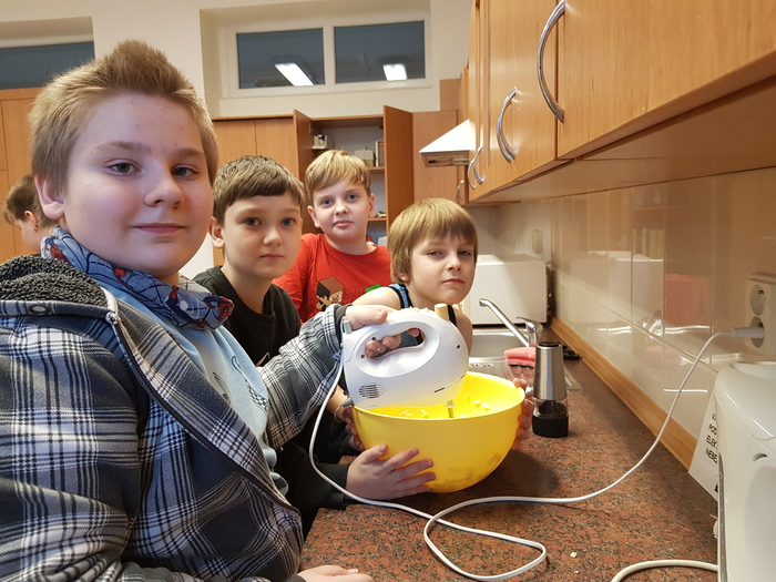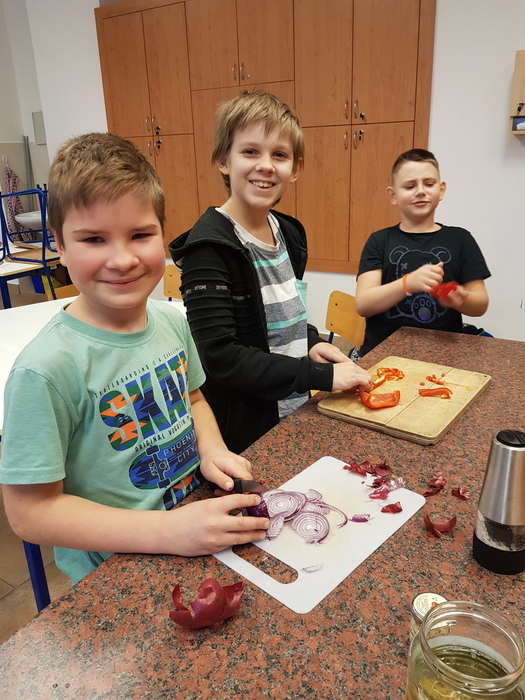 Pracovní činnosti nemusí být jen nezajímavé stříhání a lepení, proto jsme se vydali pracovat do cvičné kuchyně. V jednom týdnu děvčata a ve druhém kluci z 3. A a 3. B popadli nože, vařečky, mixér a z připravených surovin vykouzlili chutnou vajíčkovou pomazánku. Master šéfkou byla tentokrát paní asistentka, protože druhá skupina řádila ve školní dílně s pilkami a brusnými papíry. Závěrečná ochutnávka byla asi nejlepší a těžko říct, jestli vaří lépe děvčata, nebo kluci.