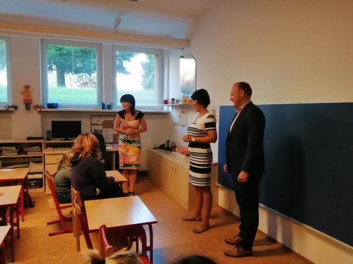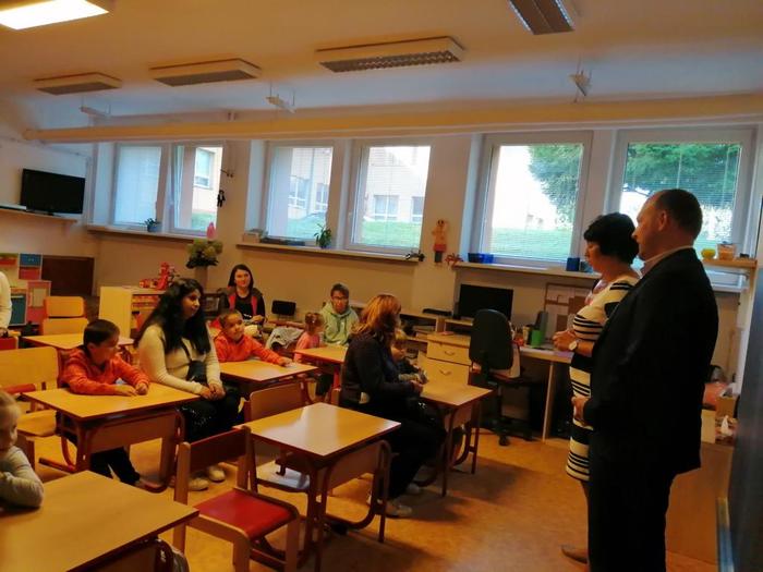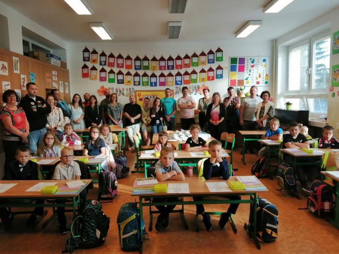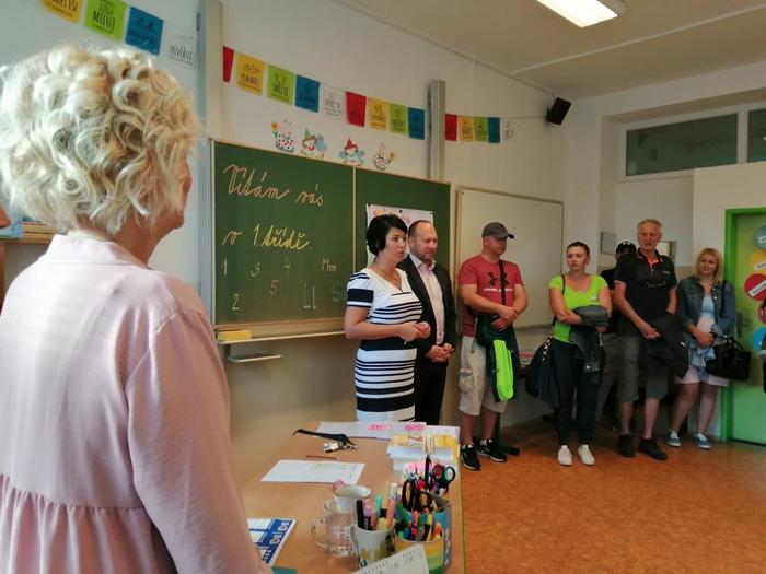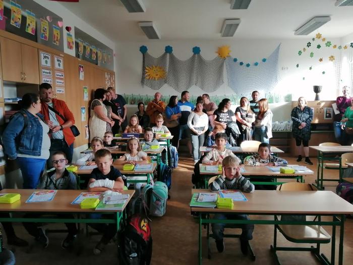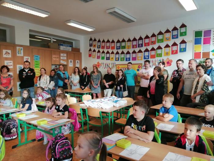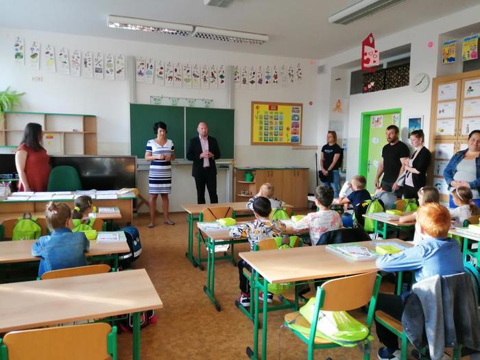 První den našich prvňáčků se moc povedl. Na začátku hodinu nás přišla přivítat paní ředitelka spolu s panem starostou.