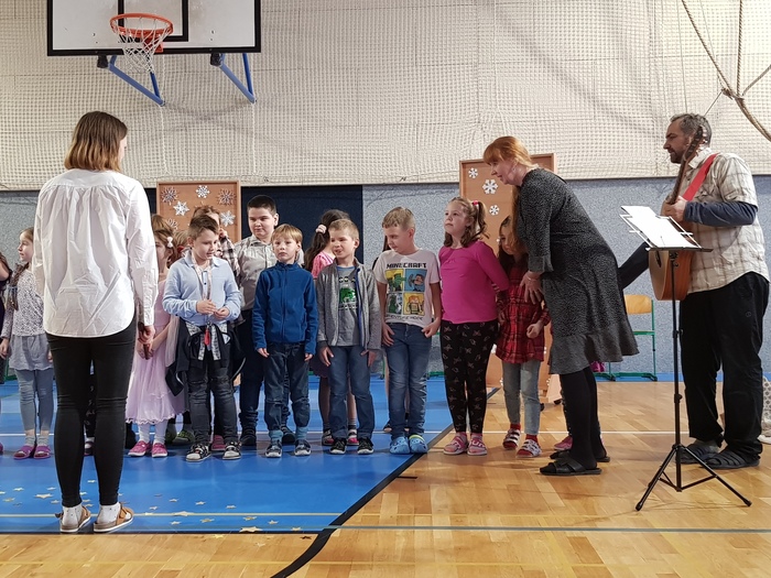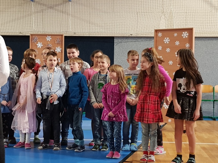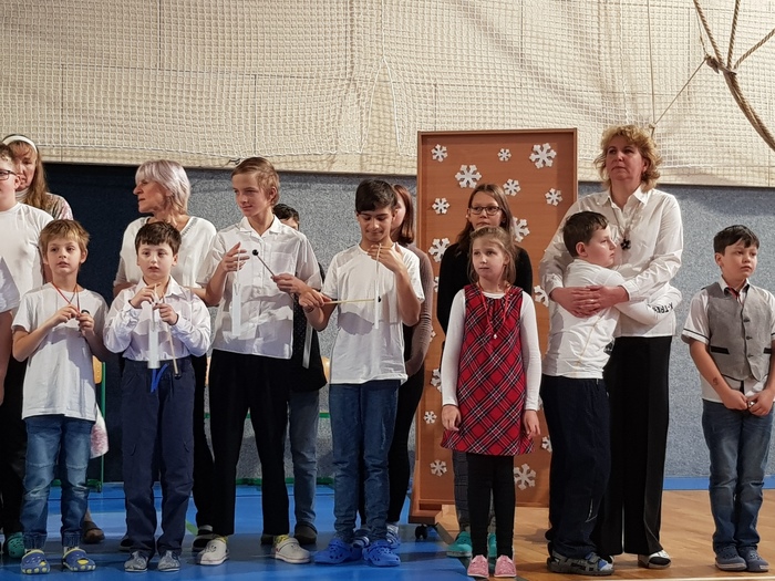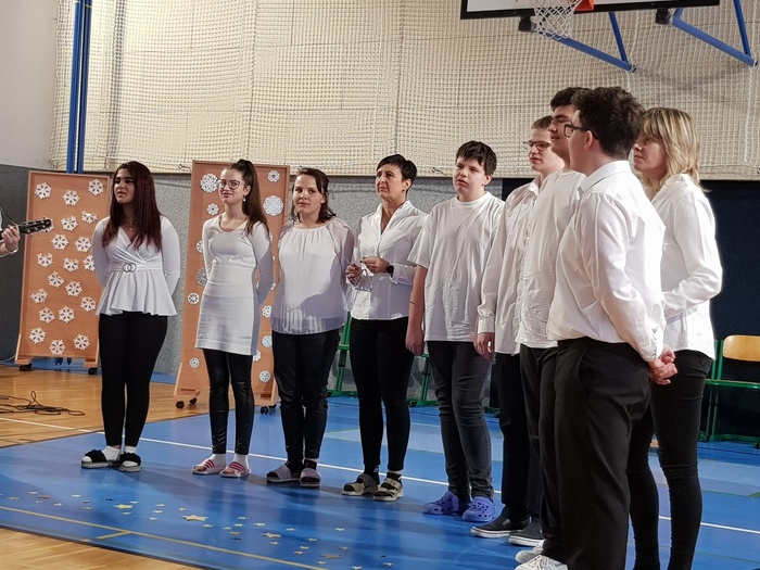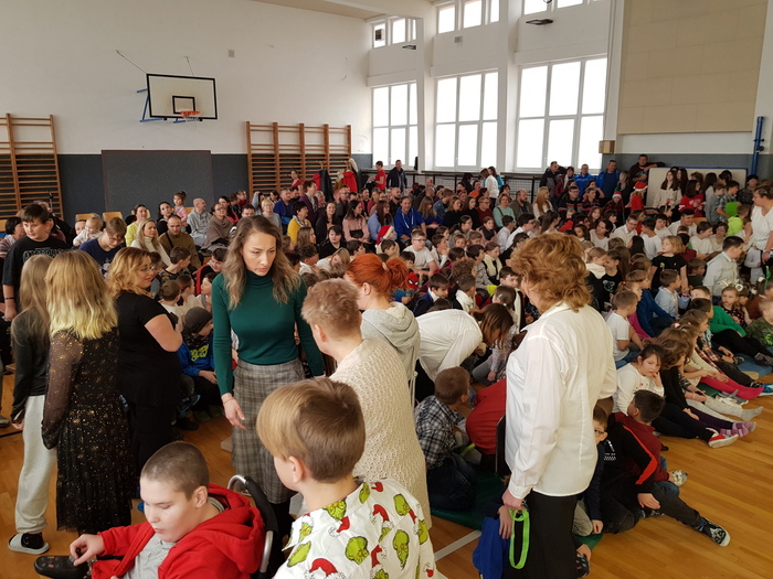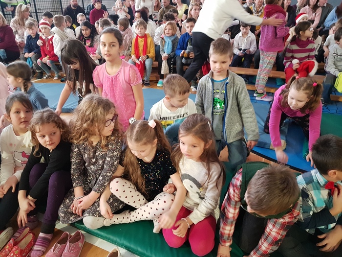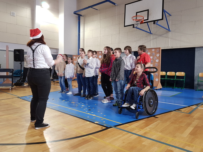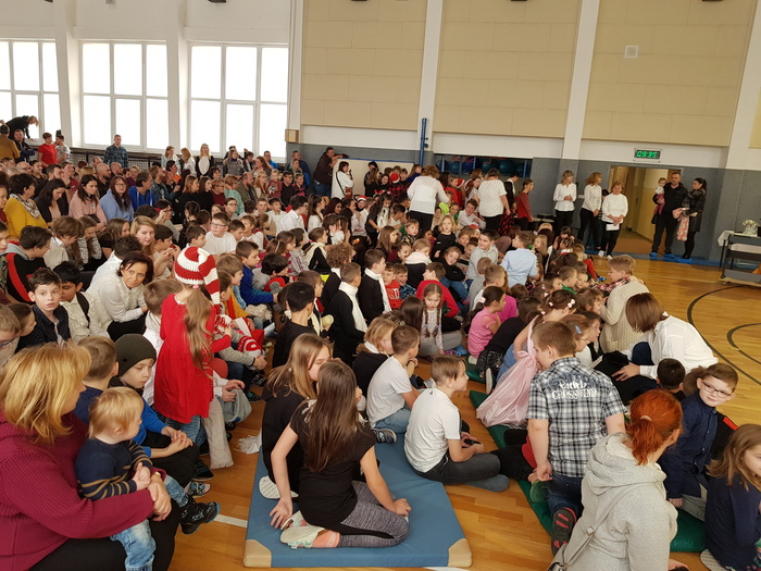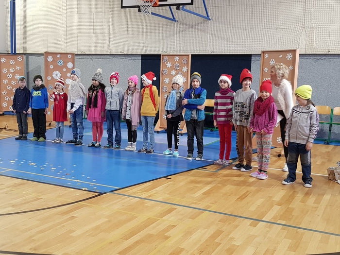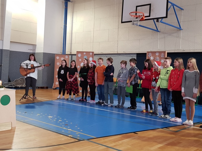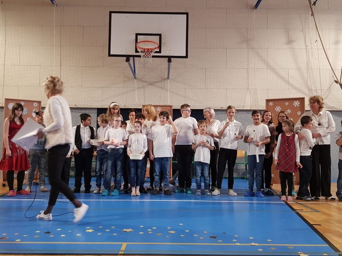 Poslední školní den roku 2022, se tělocvična rozezvučena tóny vánočních písní a básní.