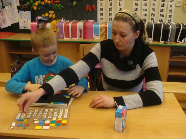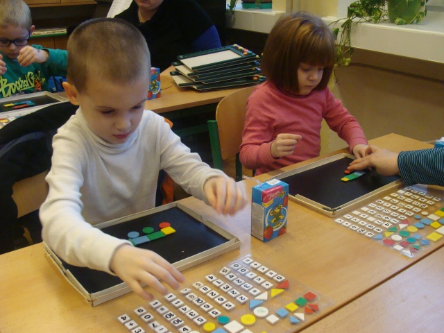 Po zápisu nám do únorového Kulíška přišlo zatím nejvíc dětí. V tělocvičně jsme se proběhli s velkými žlutými míči a potom si vyzkoušeli střílení do bedny, na koš a florbalovou hokejkou do brány. Nakonec jsme si s paní učitelkou zahráli na zvířátka a potom na auta v tunelu. Když jsme procvičili nožičky, zašli jsme do třídy procvičit také mozečky. Nejprve jsme poznávali geometrické tvary a skládali z nich obrázky. Potom nám pan učitel vysvětlil, jak se hraje s tabulkou a barevnými knoflíky. To už dalo zabrat nejen dětem, ale procvičili se i rodiče. Tenhle Kulíšek hrozně rychle utekl.