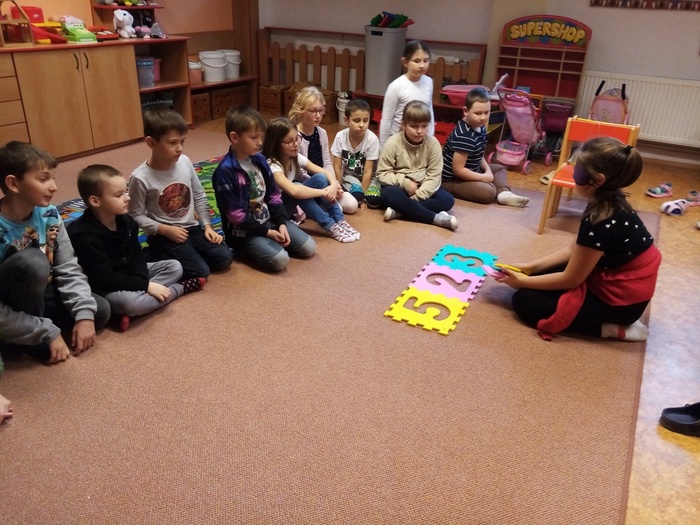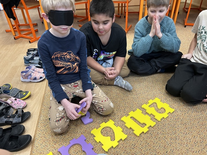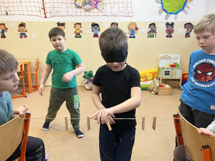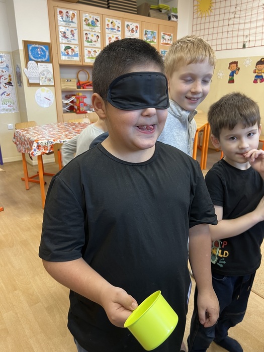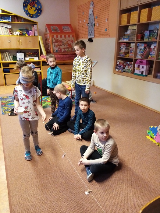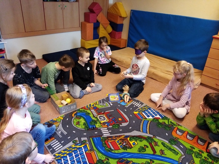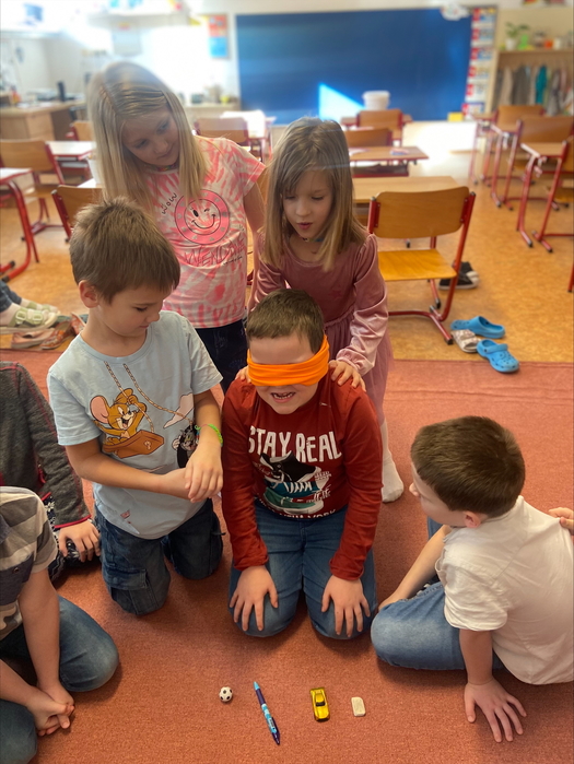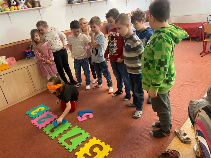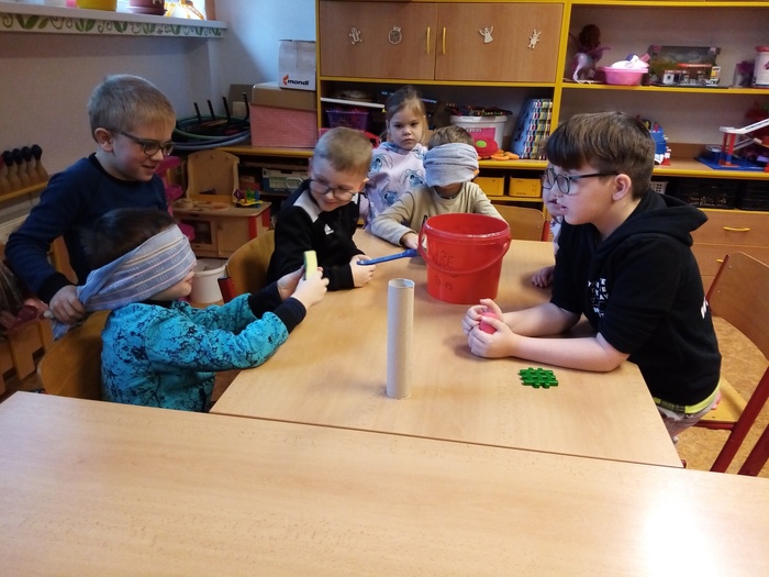 Tato soutěž se skládala ze 3 disciplín. Důležité bylo, že děti měly zavázané oči. Jako první úkol bylo poznat, zapamatovat si a vyjmenovat ve správném pořadí 7 věcí. Dále pak správně a rychle vložit čísla do pěnového puzzle a nakonec spočítat kolíky na nataženém provázku.