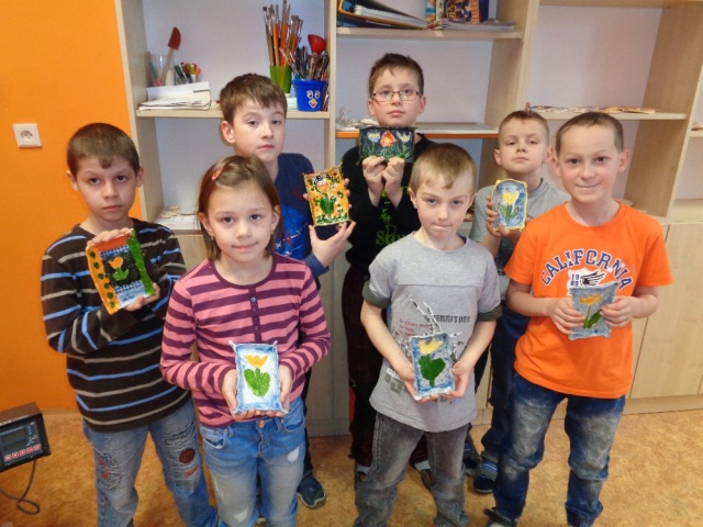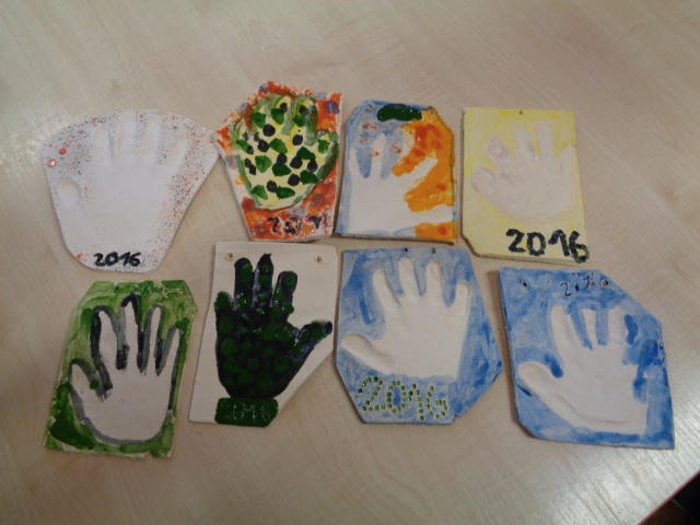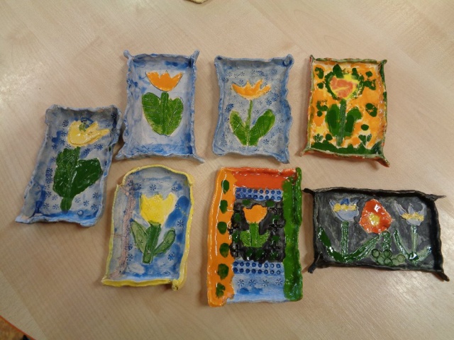 V keramickém kroužku vyráběly děti jarní keramiku pod vedením paní učitelky Prokopové. Vytvořily podnosy na bonbóny, ozdobené tulipány. Na otisky rukou do hlíny si vyryly letošní rok. Všechny výrobky se vydařily.