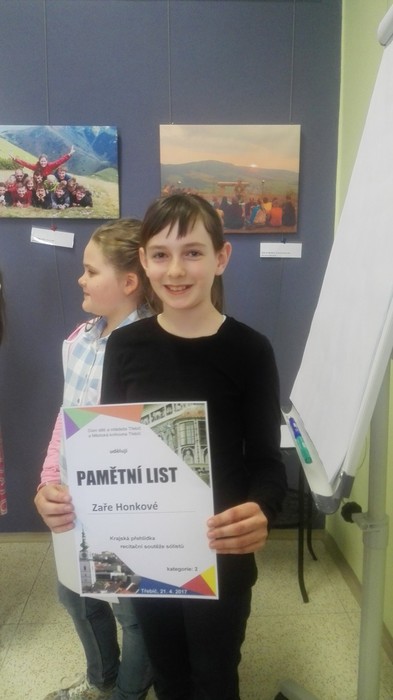 Zara Honková z 5.A se 21. dubna zúčastnila krajského kola sólové recitace v Třebíči. Podala skvělý výkon a proto postupuje na Celostátní přehlídku recitátorů, která se uskuteční 9. až 11. června ve Svitavách. Gratulujeme :o) Paní učitelce Gabině Buchtové děkujeme za skvělou přípravu a vedení....