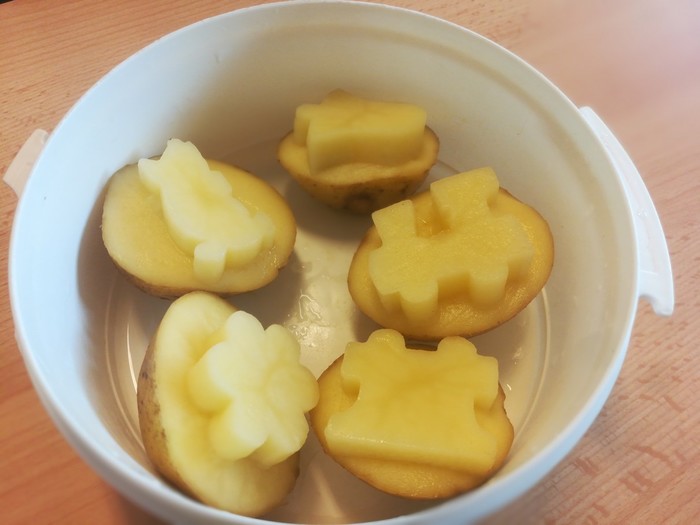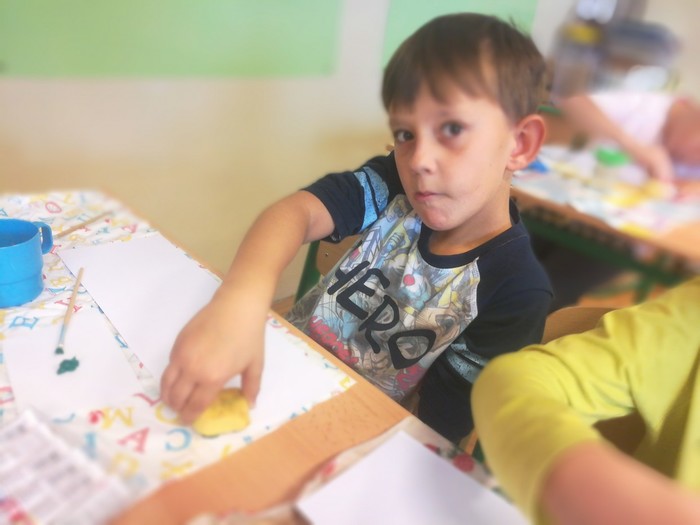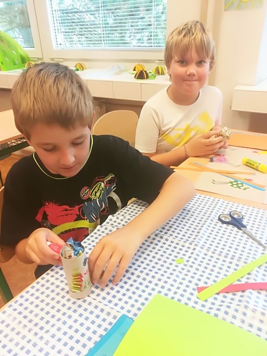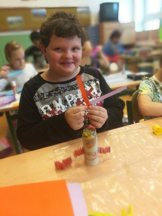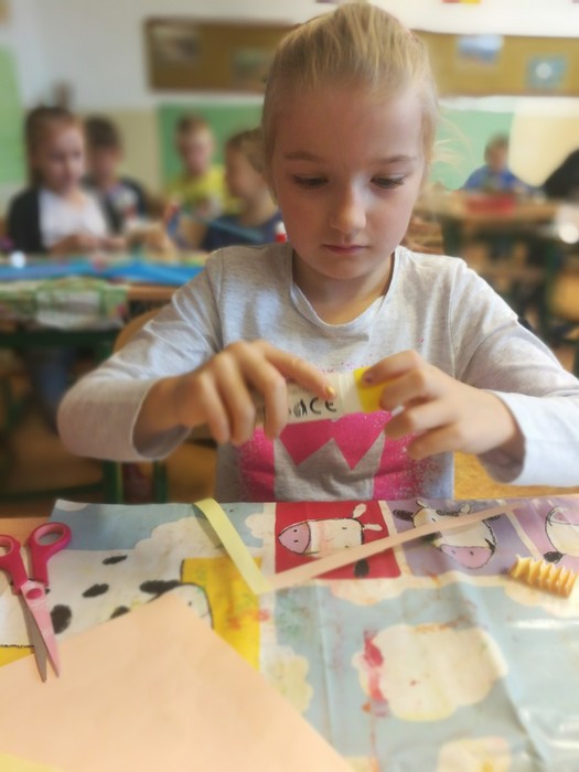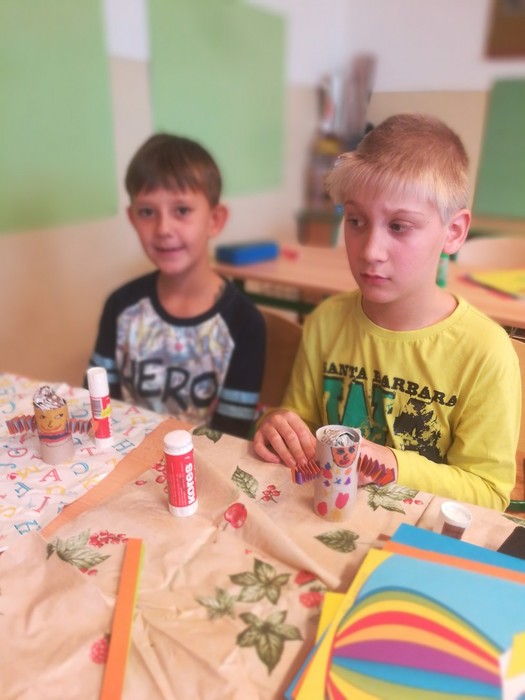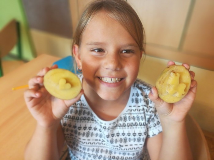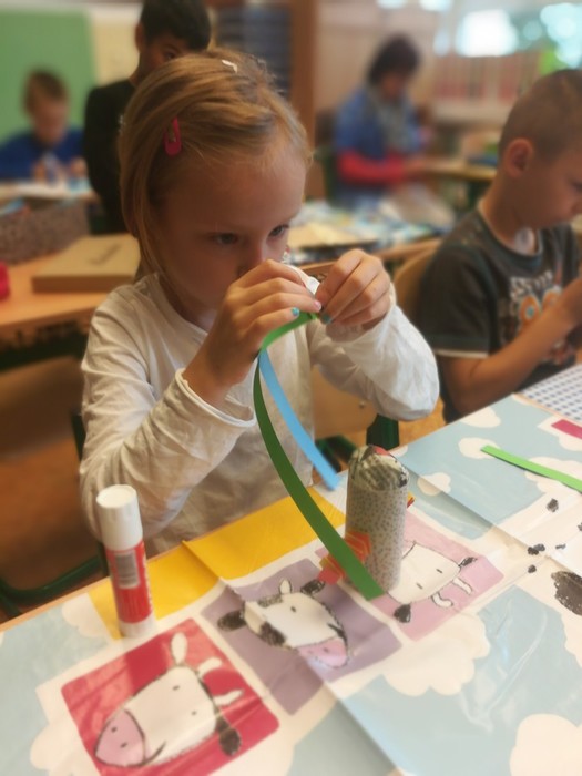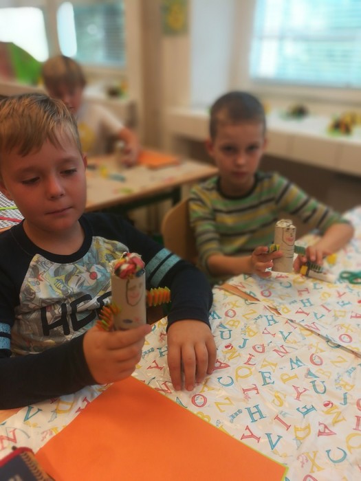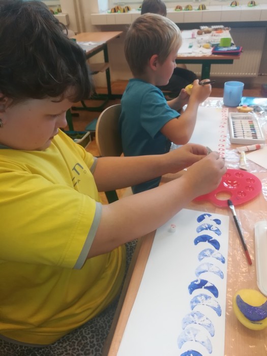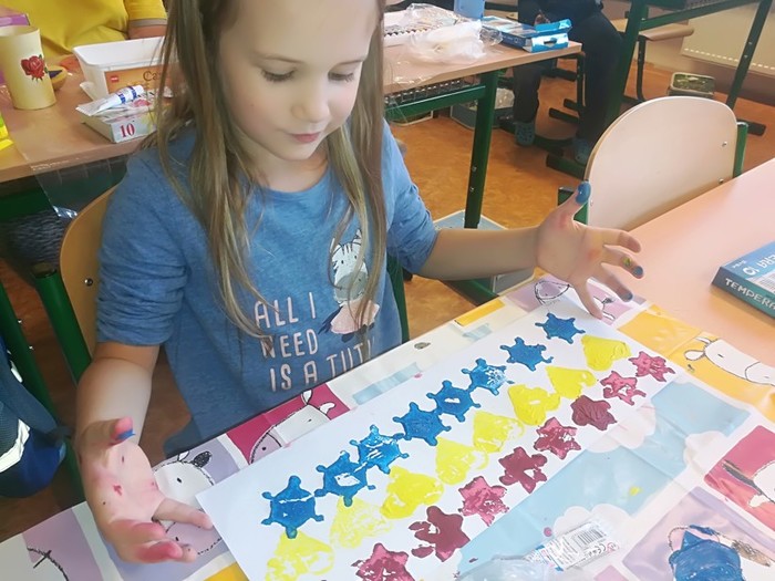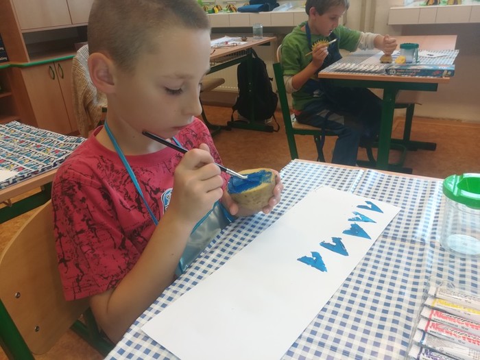 Krásné panáčky z papíru si vyrobily děti ve 3.A. Složit ručičky z papíru nebyla žádná hračka, ale všichni si s tím hravě poradili. V další hodině si žáčci vyrobili tiskátka z brambor....